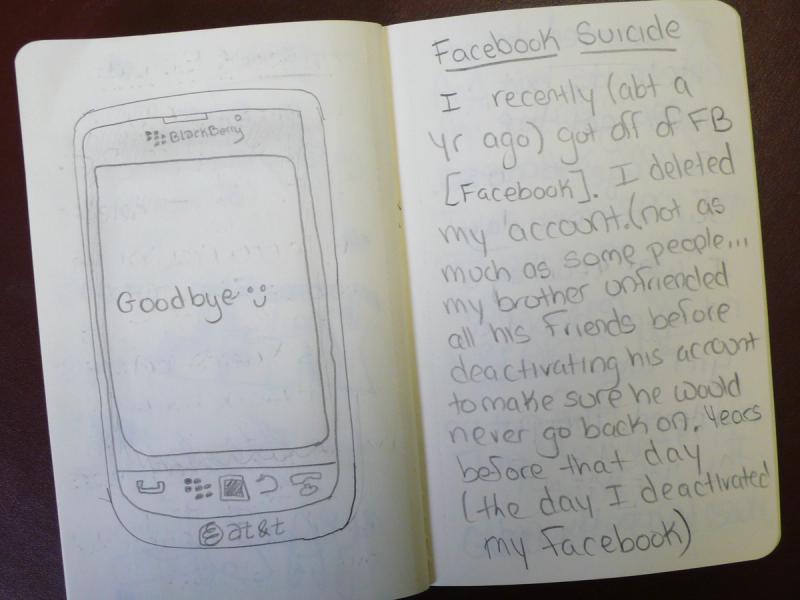 Some of my students shared personal thoughts about their relationships with technology, other people and themselves; others were less reflective. Most of them enjoyed the project; a few less so. The author of this journal (below) considered the journal a burden. On another page, he implored, “Facebook, why are you so terribly distracting?”